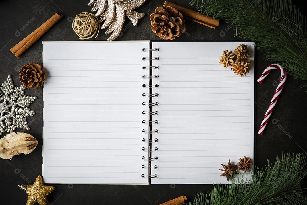 Cartão de moldura de Natal de férias e notas de livro aberto em bra...