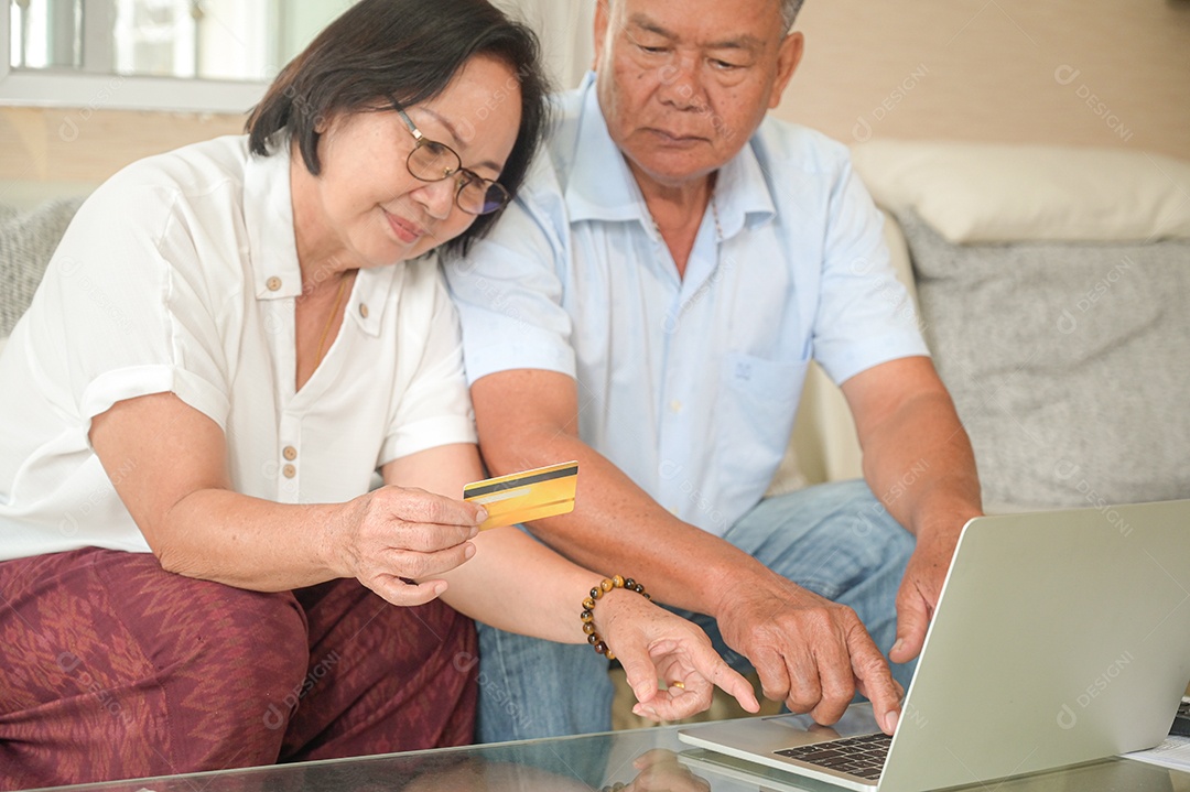 Mulher e homem asiáticos estão sentados no sofá. Eles estão usando laptops e consultam pagamentos online com cartão de crédito.