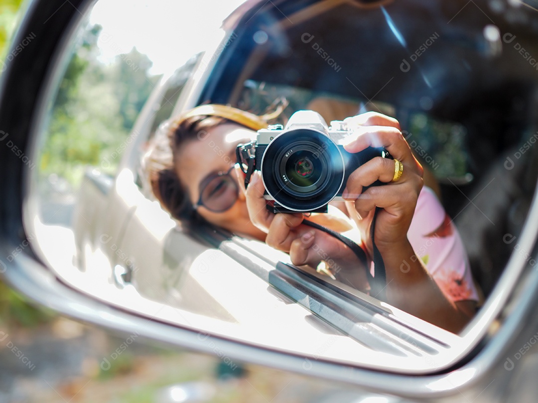 Uma jovem segurava uma câmera digital e tirou uma foto de si mesma.