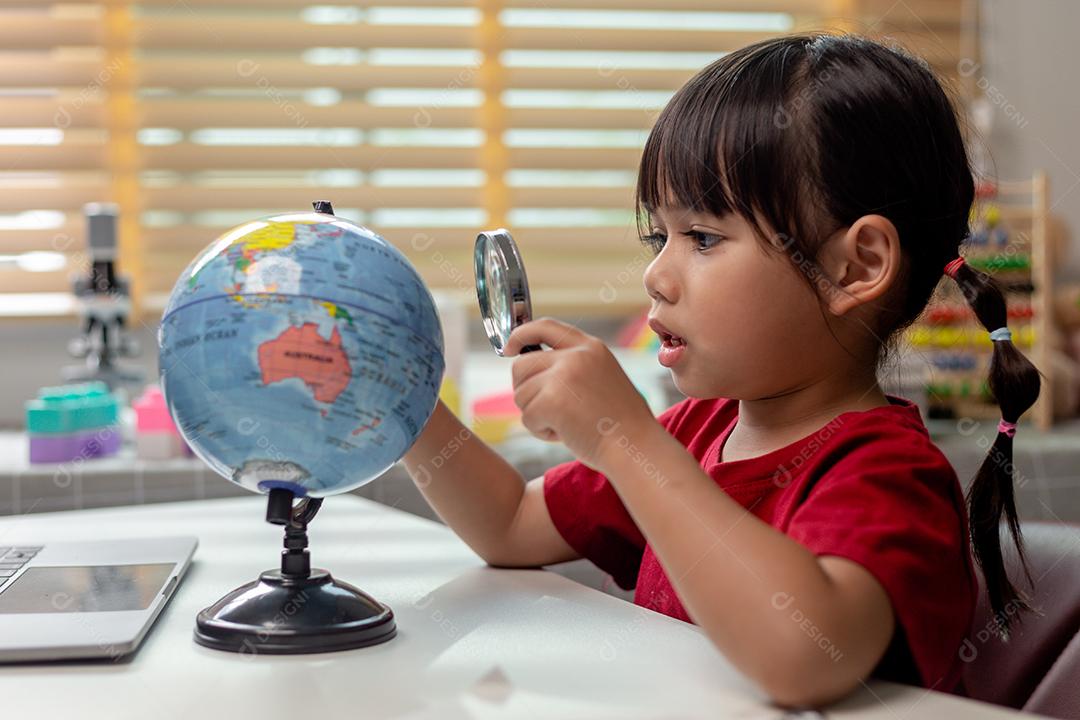 A garotinha asiática está aprendendo o modelo do globo, o conceito de salvar o mundo e aprender através da atividade lúdica para a educação infantil em casa.