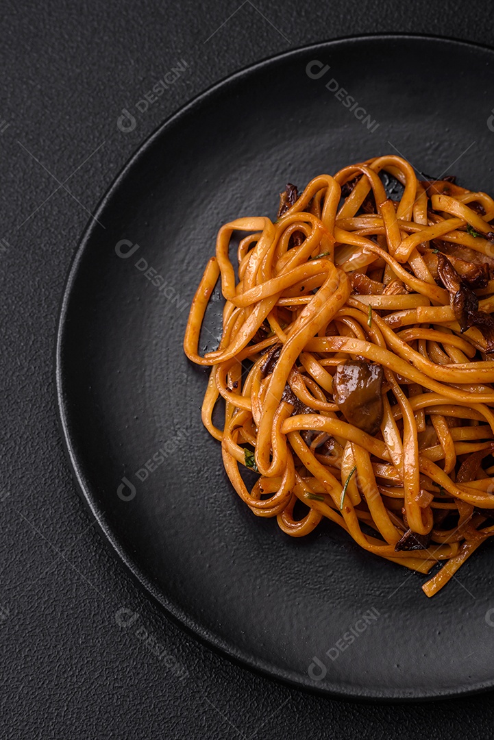Delicioso macarrão ou udon com cogumelos, sal, especiarias e ervas ...