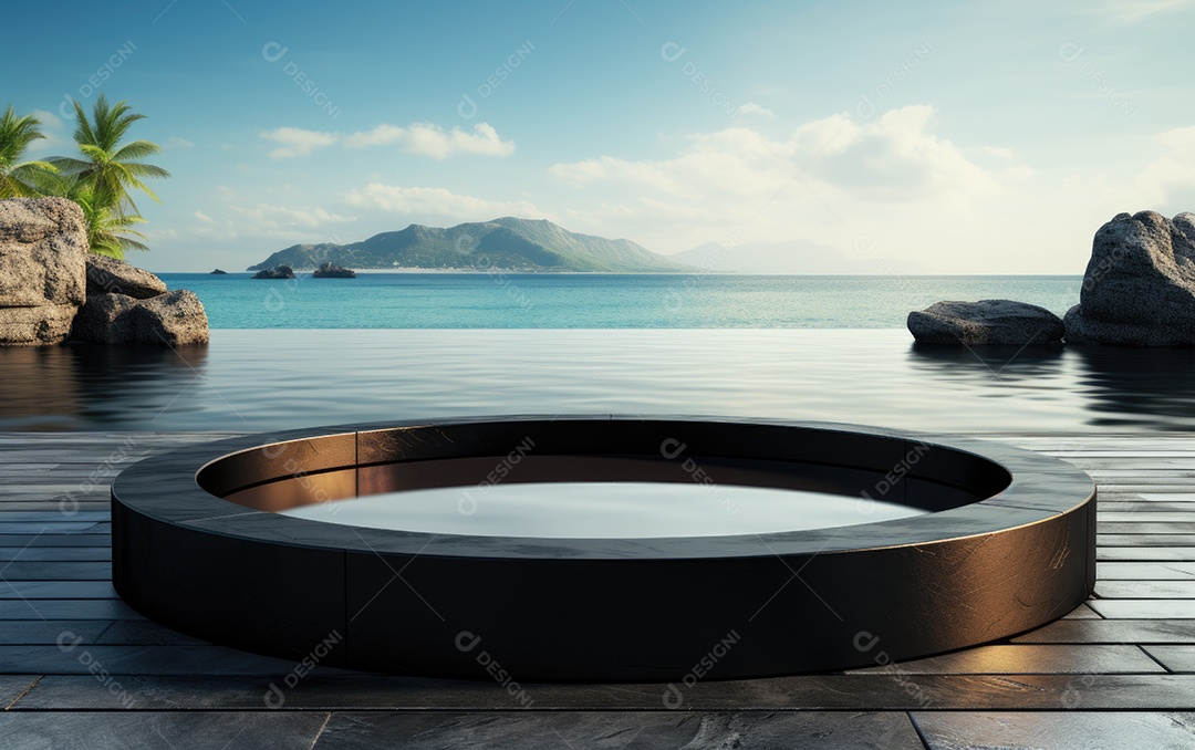 Pódio de mármore preto vazio na mesa sobre fundo de praia tropical