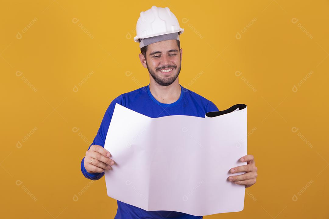 Homem jovem arquiteto com capacete e segurando plantas isoladas em ...
