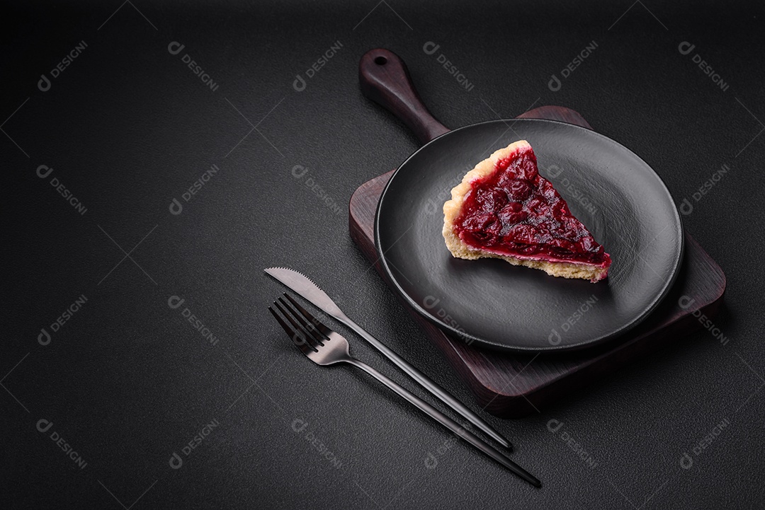 Deliciosa torta doce perfumada com bagas de cereja em uma placa de cerâmica sobre um fundo escuro de concreto