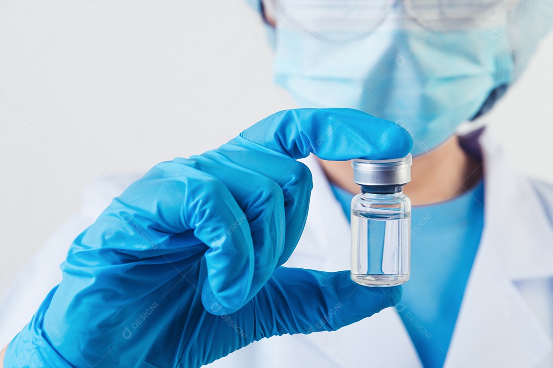 Frasco de close-up da vacina covid-19 na mão de cientista profissio...