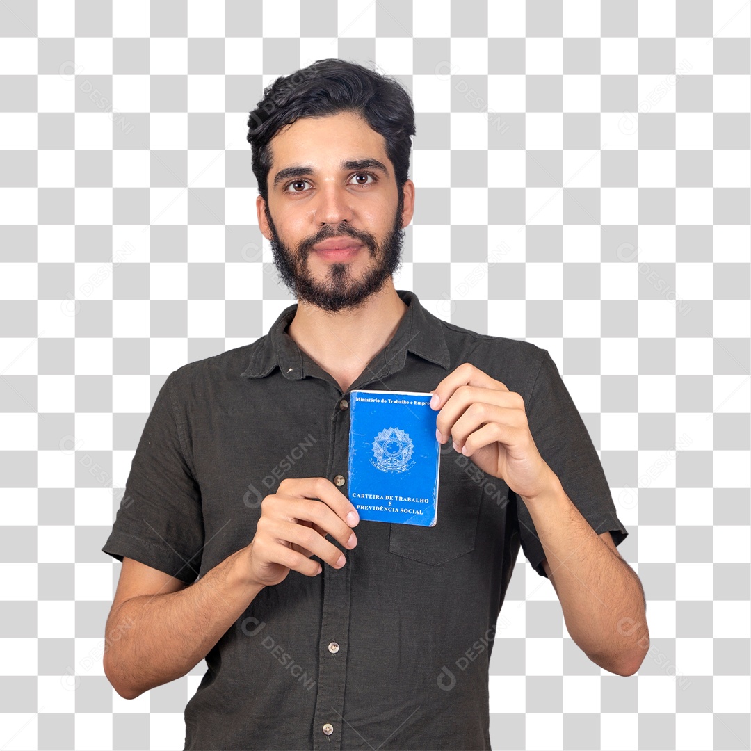 Jovem rapaz de camiseta cinza segurando sua carteira de trabalho