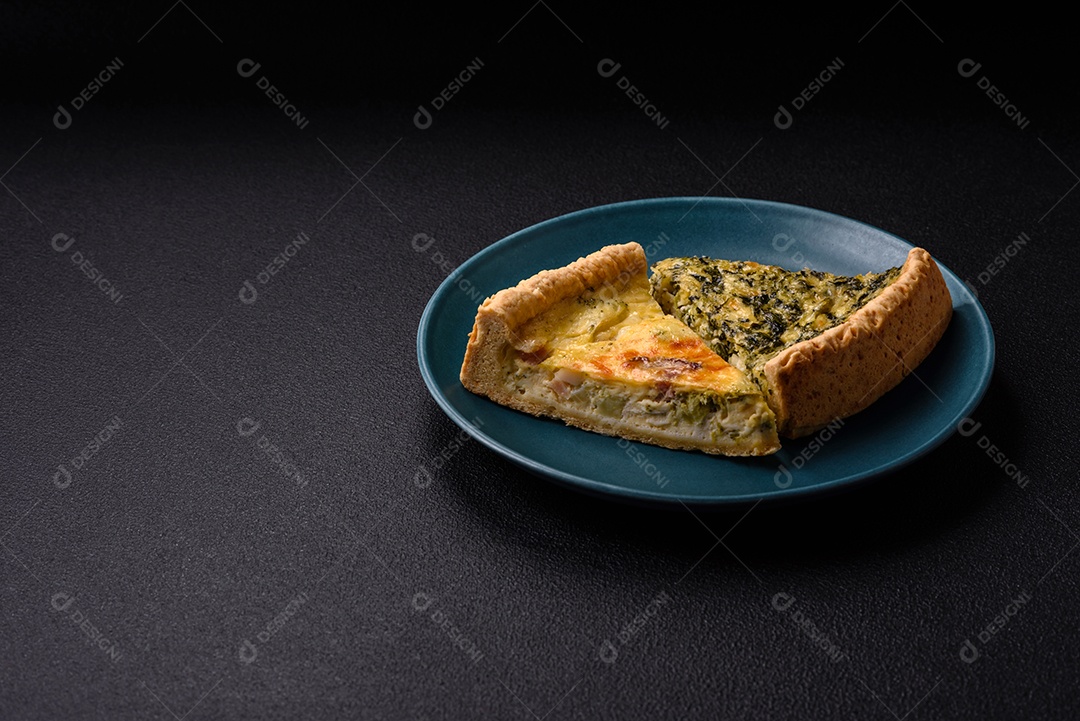 Deliciosa quiche crocante cortada em fatias com queijo, brócolis, tomate, sal, especiarias e ervas sobre um fundo escuro de concreto