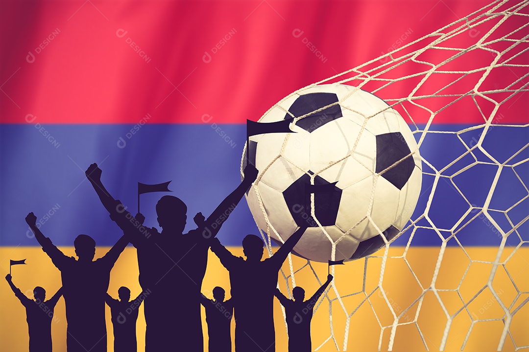 Silhuetas de fãs de futebol com a bandeira da Armênia.