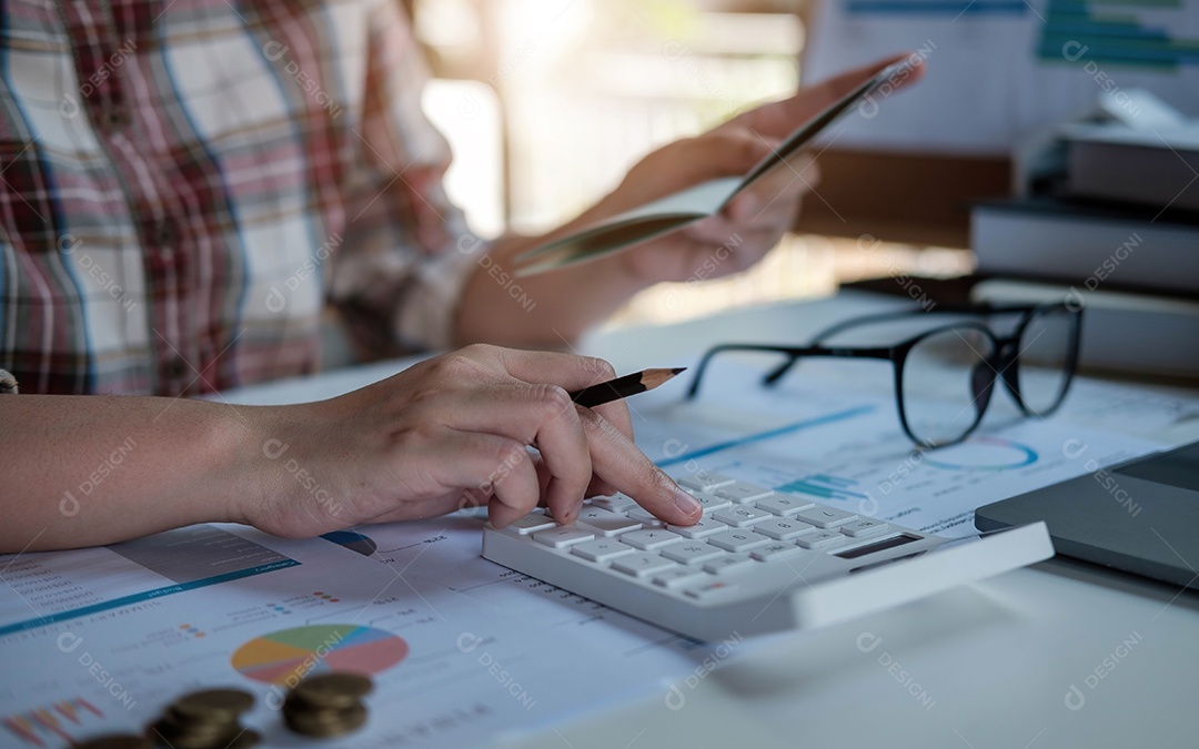 Jovem mulher asiática verificando contas, impostos, saldo de conta ...