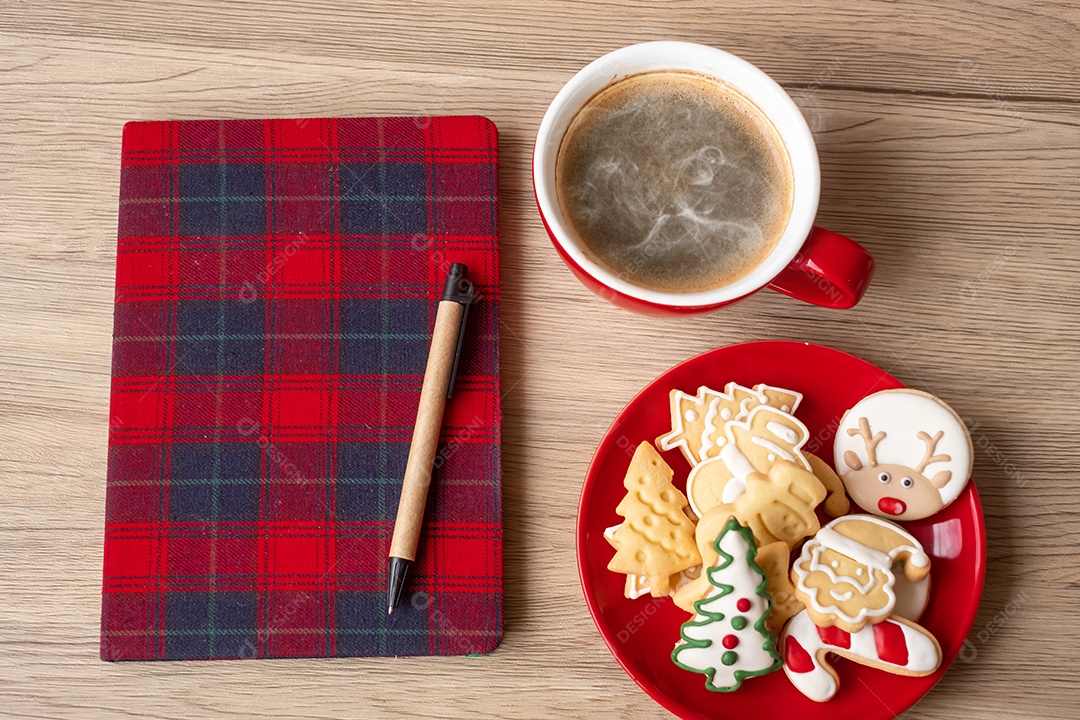 Caderno em branco, xícara de café, biscoitos de Natal e caneta na m...
