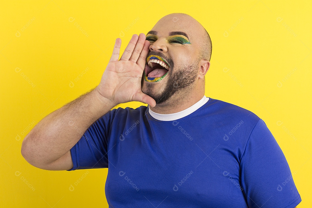 Jovem gay maquiado com gesto de gritar