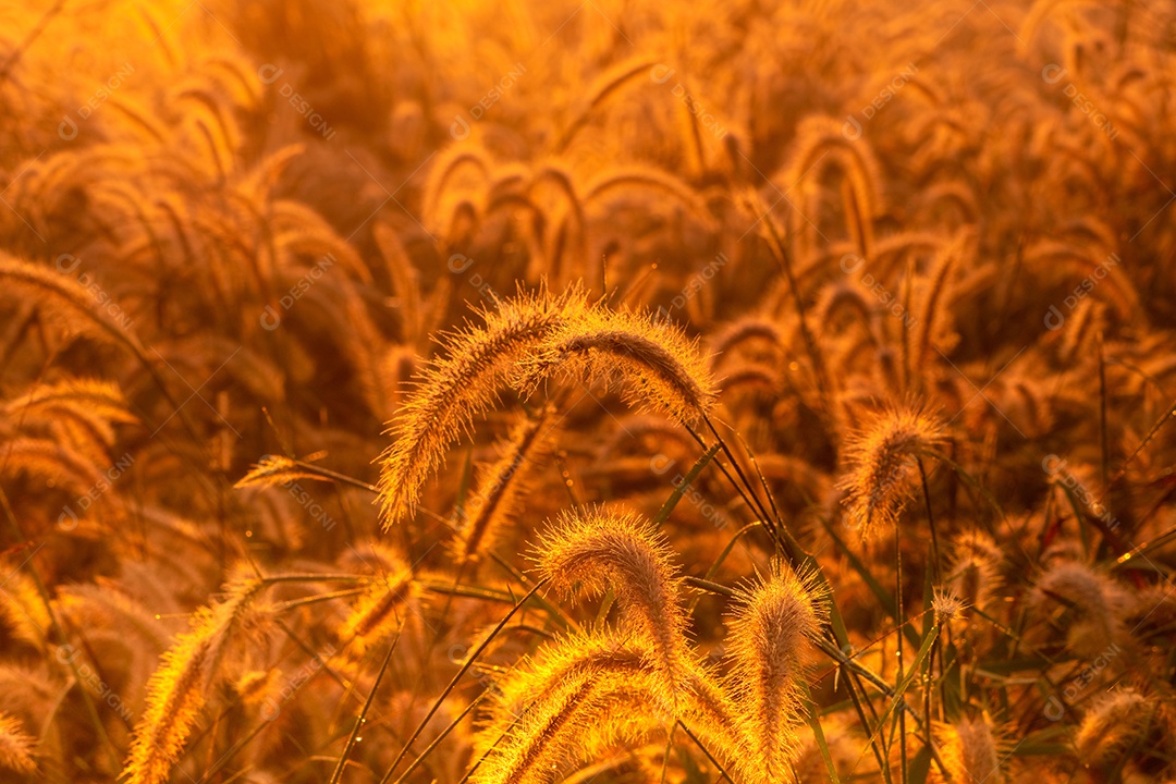Flor de grama pela manhã ao nascer do sol com sol dourado.