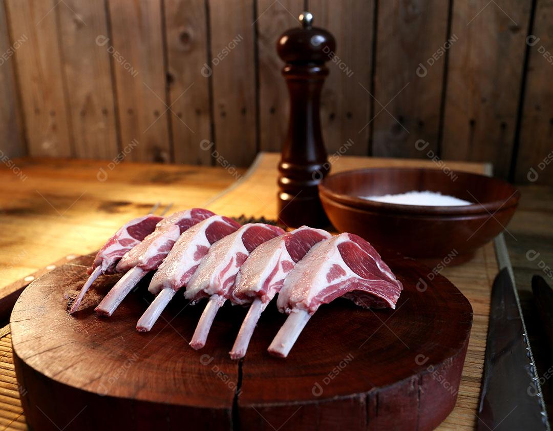 Foto Prateleira Francesa Pedaços Crus Cordeiro Cortados Tábua Madeira Sal Pimenta Fundo