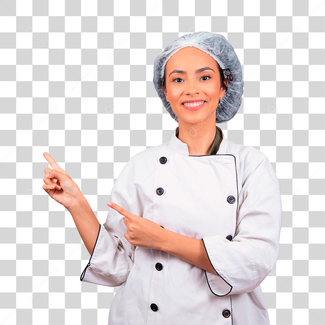 Linda mulher jovem usando avental de cozinheiro branco apontando para o lado