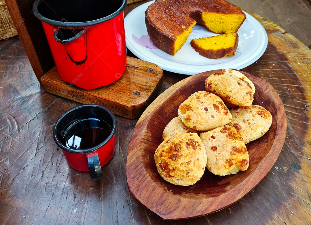 Pão de queijo bolo de milho e garrafa de café delicioso café da manhã