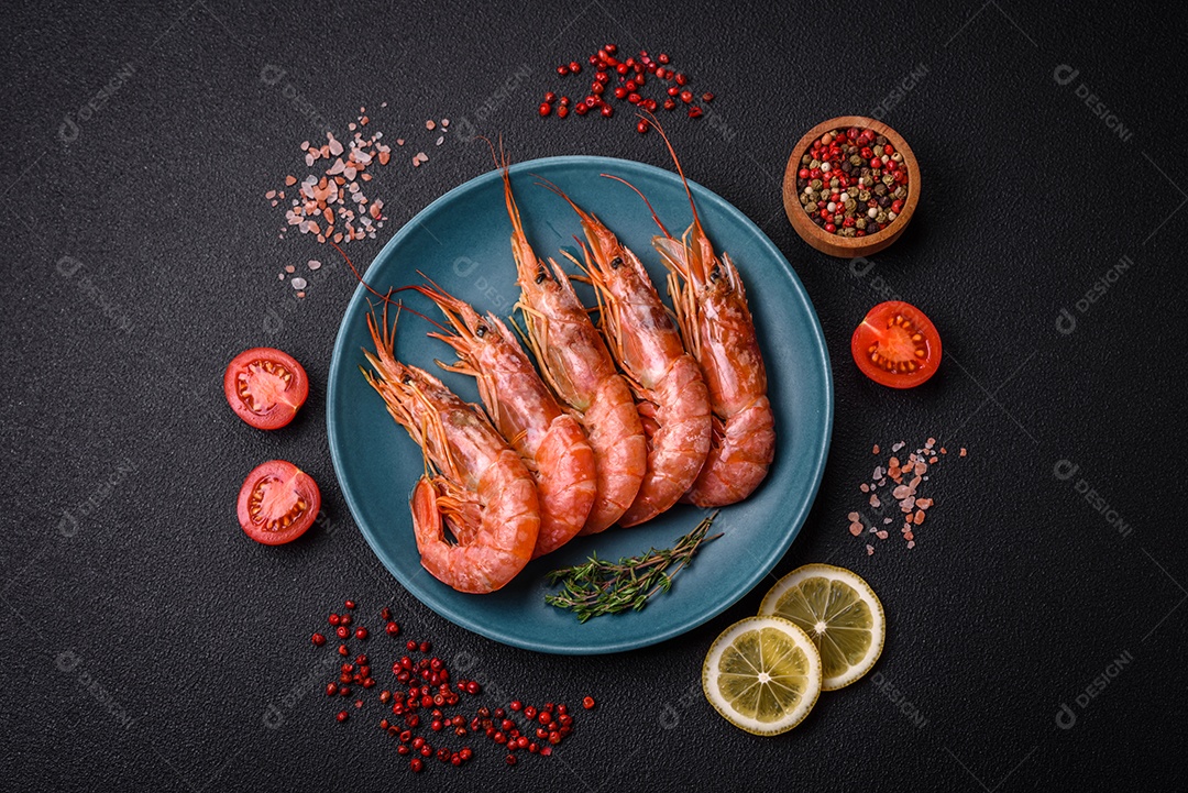 Camarão tigre ou lagostim fervido com especiarias e sal sobre um fundo escuro de concreto