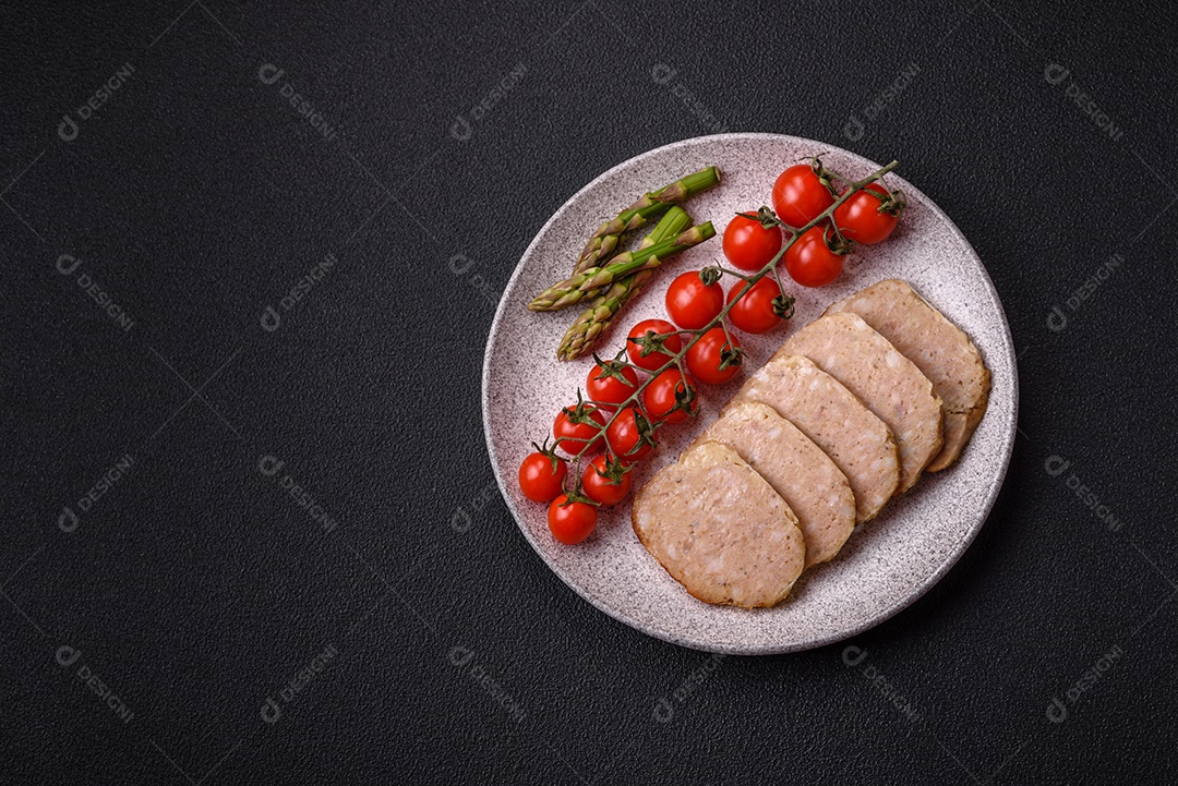 Rolo delicioso ou linguiça de frango picada caseira com sal, especiarias e ervas sobre um fundo escuro de concreto