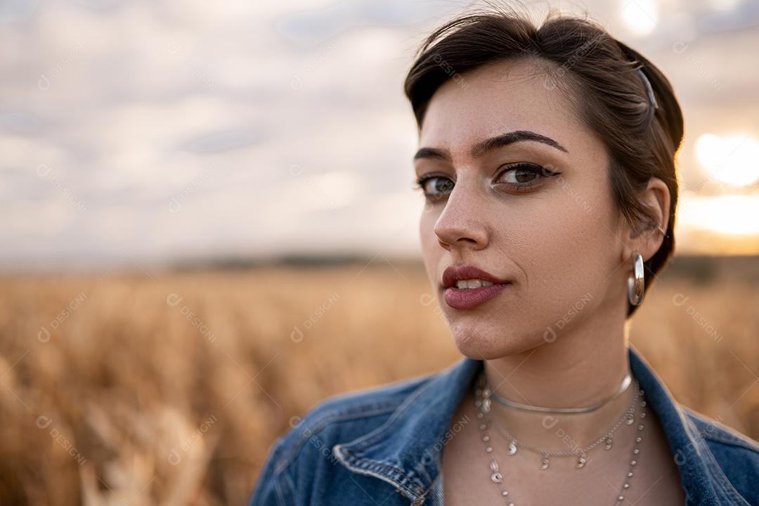 Linda jovem latina de cabelo curto, mulher ao ar livre retrato. Moda