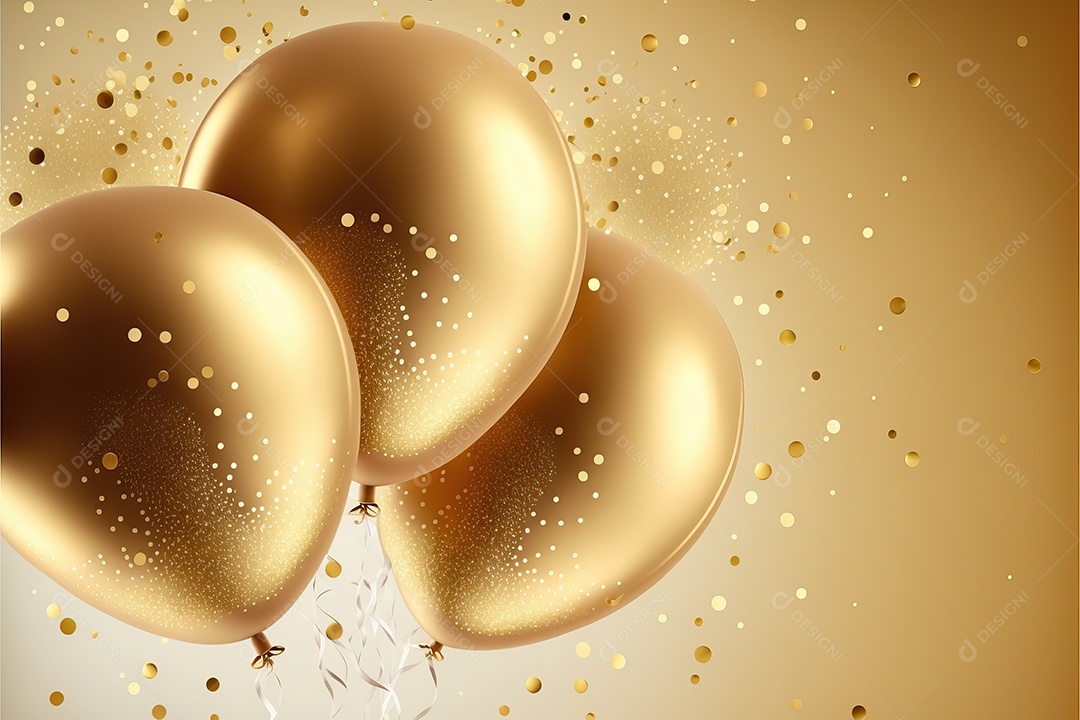 Balões de festa de folha de ouro sobre fundo de confete dourado e s...