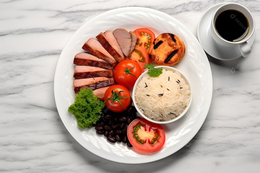 Prato de comida arroz salada carne e molho sobre uma mesa de restau...