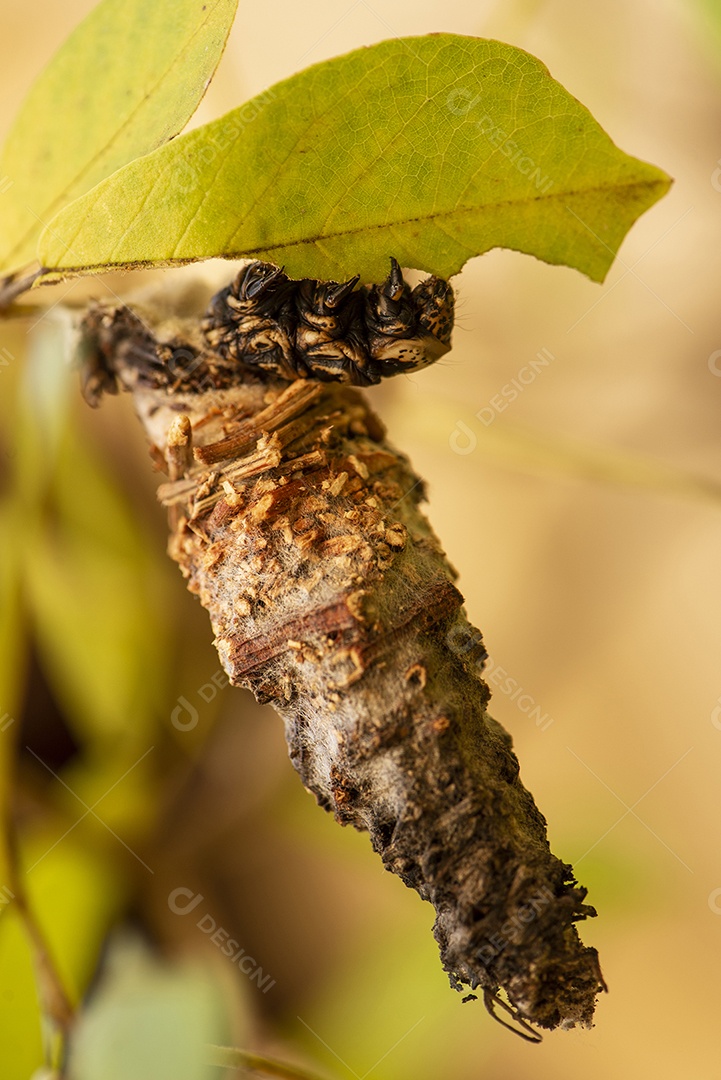 Lagarta com parte do corpo fora de seu casulo em um galho de árvore