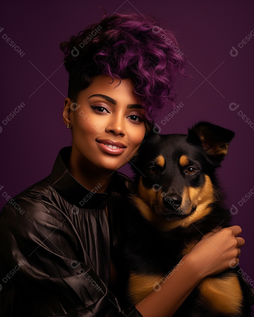 Uma mulher branca com seu cachorro acariciando seu cachorro em um fundo colorido