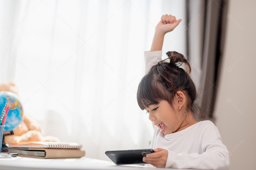 Menina asiática usando um telefone de perto, distraída do estudo.