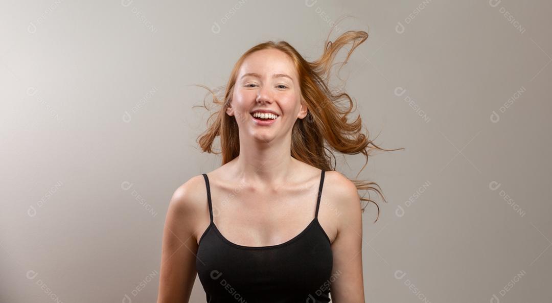 Retrato de linda ruiva alegre sorrindo rindo olhando para a câmera ...