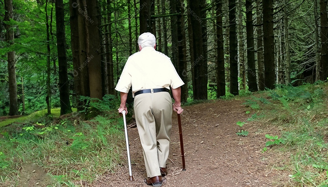 Homem idoso fazendo caminhada na floresta