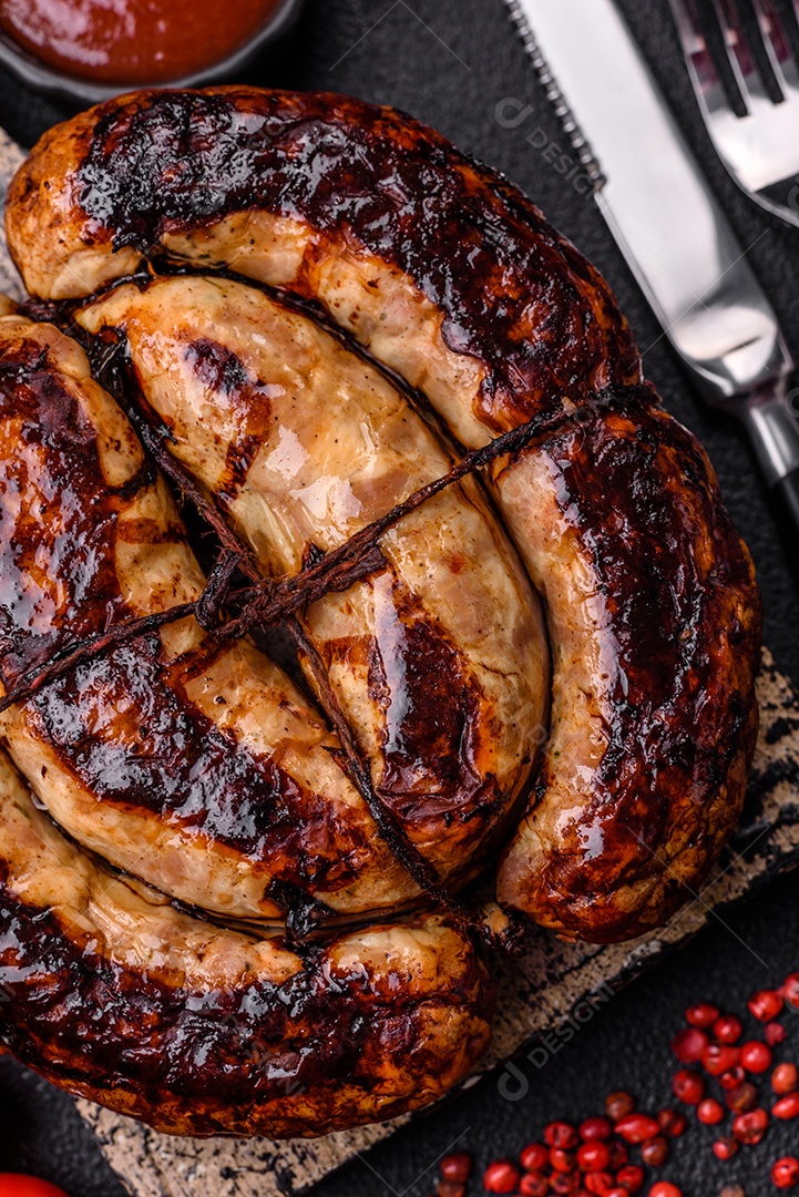 Deliciosa salsicha grelhada em forma de anel com sal, especiarias e ervas sobre fundo escuro de concreto