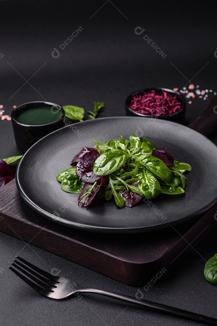 Deliciosa salada fresca composta por espinafre, acelga, radicchio, gráfico vermelho, sangue de touros e rúcula em uma placa preta sobre um fundo escuro de concreto