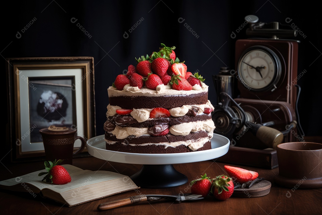 Sobremesa tentadora: bolo de chocolate com ganache, morangos e chantilly.