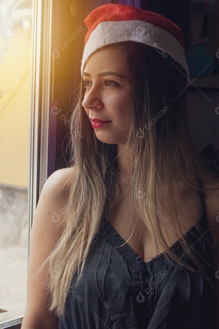 Retrato da linda e feliz Sra. Claus com chapéu de Natal. Isolado so...