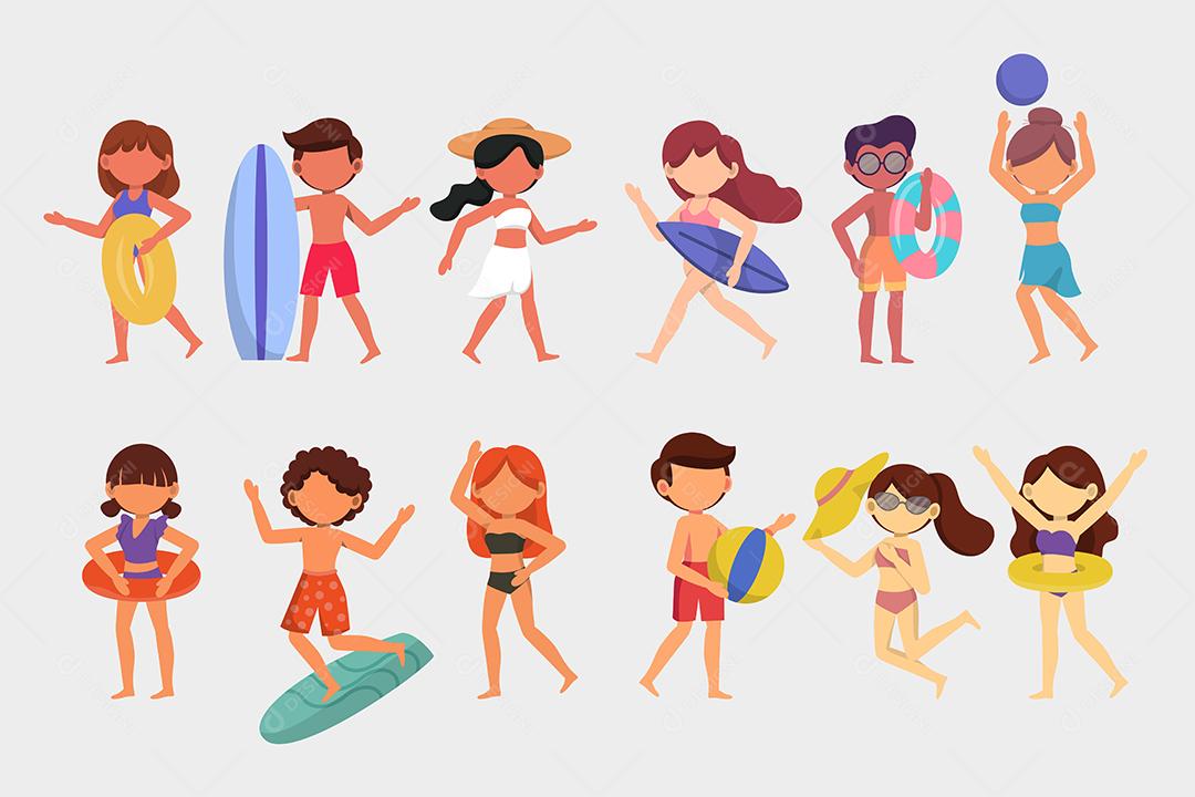 Pacote de personagens infantil de homem e mulher Praia Verão Feéria...