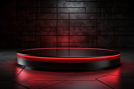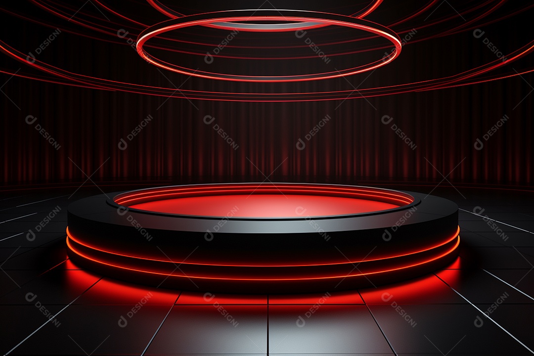 Pódio redondo com luz vermelha e fundo preto para simulação de imag...
