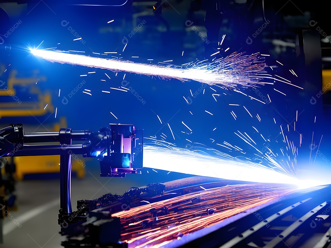 O braço robótico industrial moderno de alta tecnologia na linha de produção da fábrica está sendo soldado.