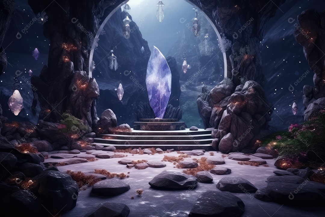 Belo altar esotérico e místico para meditação com cristais e pedras semipreciosas, Templo Zen.