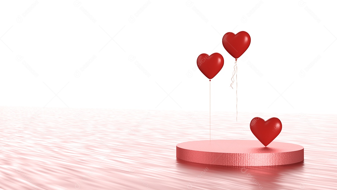 Feliz dia dos namorados conceito com balão de forma de coração vermelho no estande do produto. Tema do evento do dia dos namorados. Aniversário e objeto. Renderização de ilustração 3D.