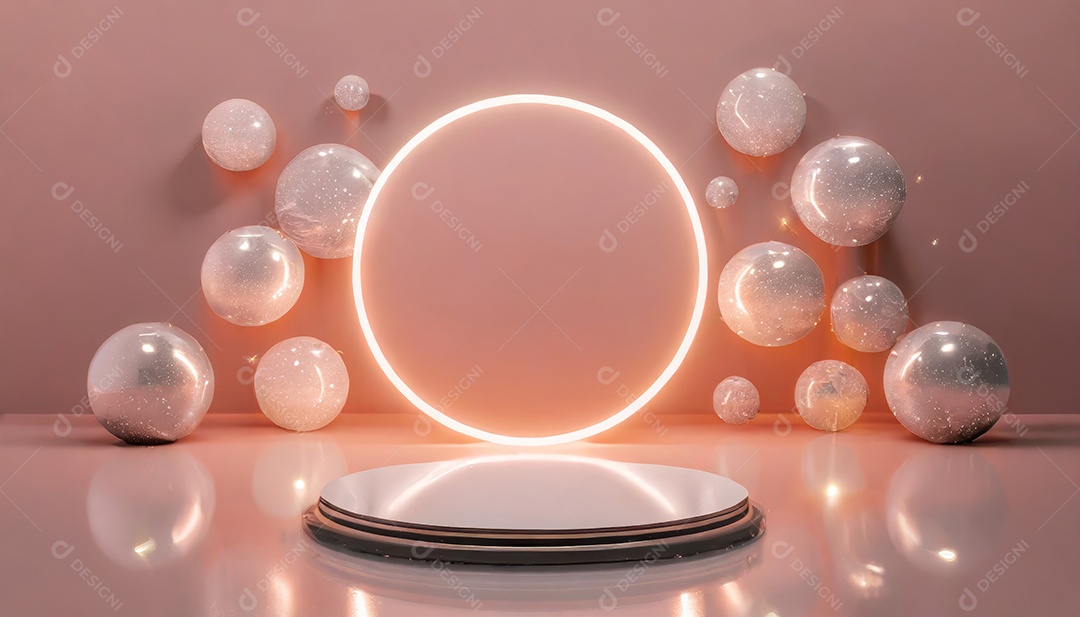 Conceito de dia dos namorados. Pódio de pedestal de cilindro rosa e 3D realista com lâmpada de néon brilhante. Uma cena mínima para a vitrine do palco dos produtos.