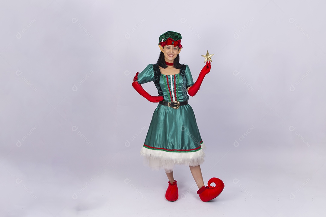 Linda jovem com fantasia de duende em fundo branco