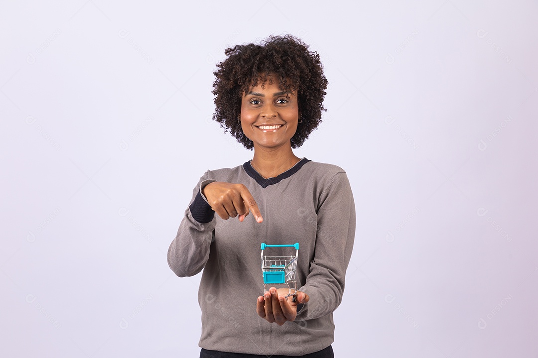 Linda mulher garota jovem cabelo afro segurando carrinho de compras
