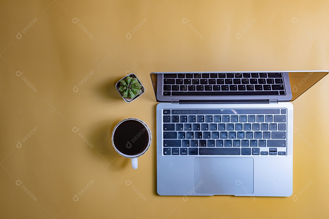 Computador portátil e cacto em fundo amarelo. Vista superior cópia ...