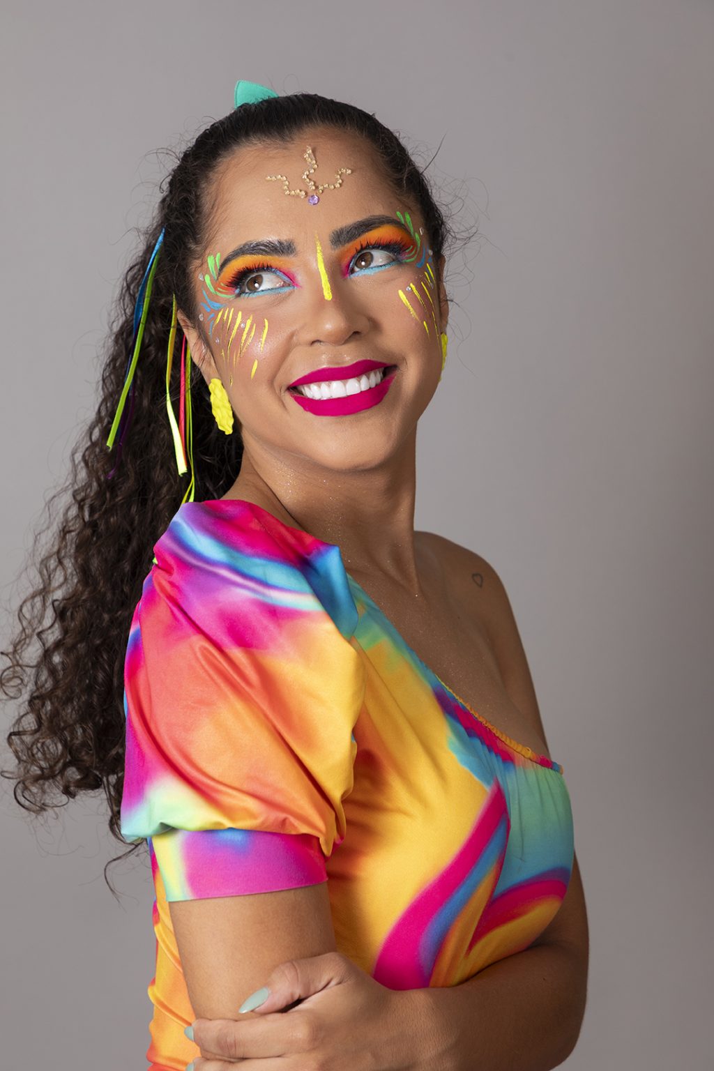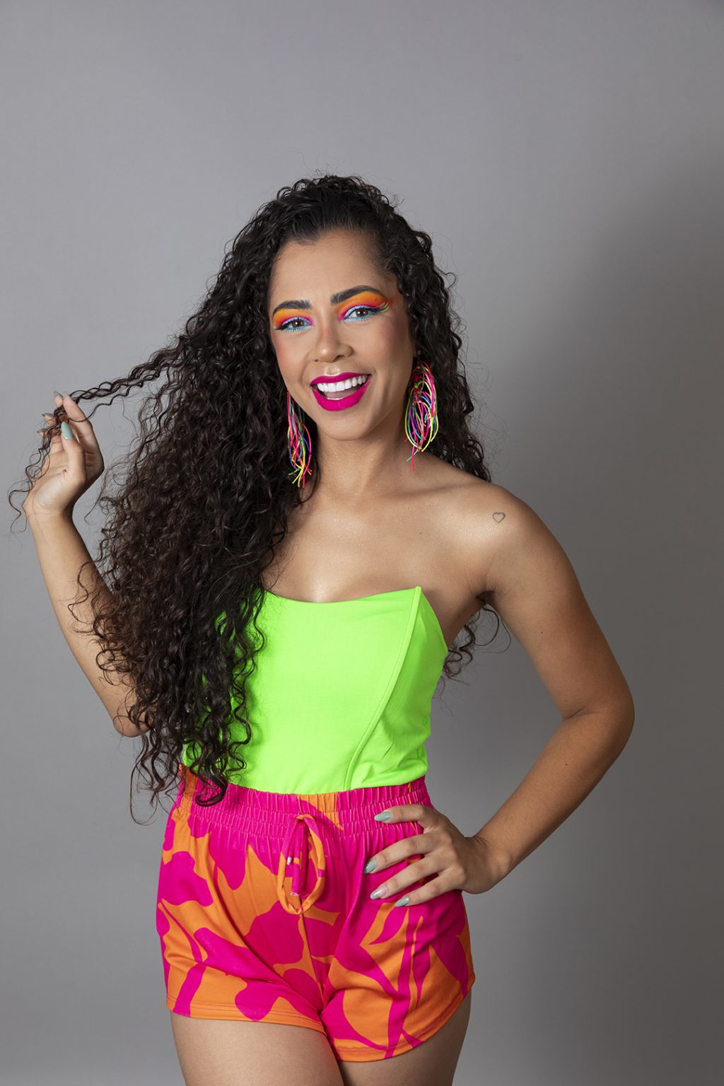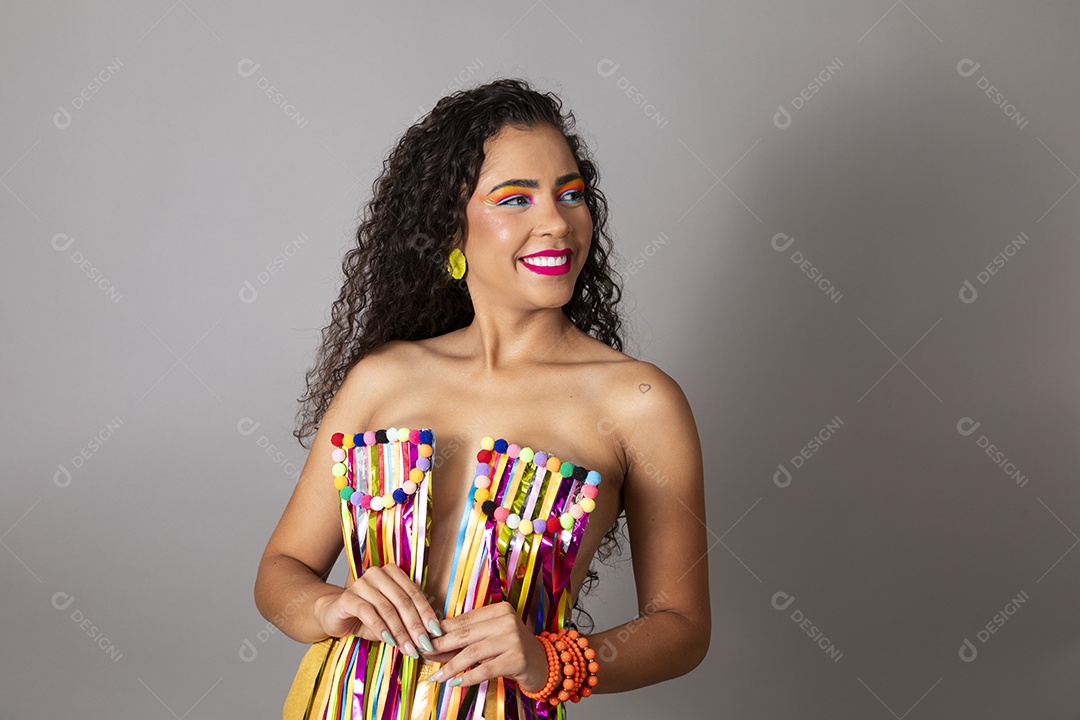 Linda morena do cabelo cacheado sorridente fantasiada sobre fundo i...
