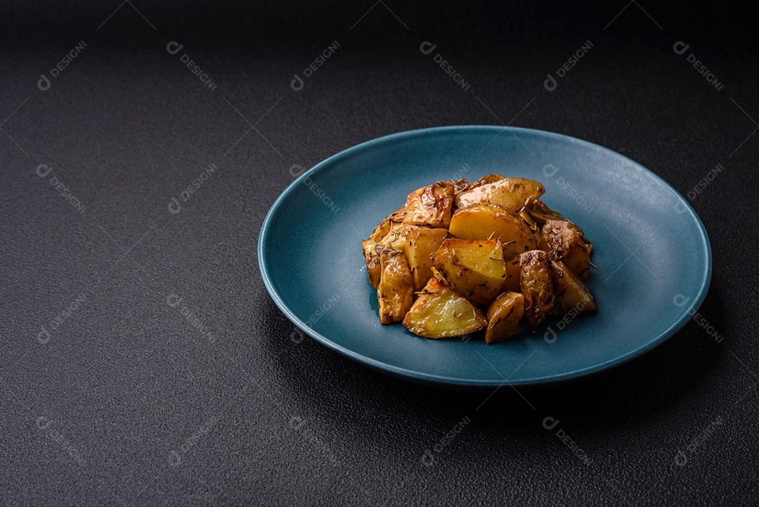Deliciosas fatias de batata frita crocante com sal, especiarias e ervas sobre um fundo escuro de concreto