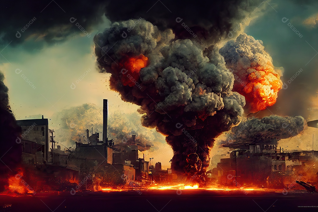 Conceito de terceira guerra mundial nuclear destruindo cidades, con...