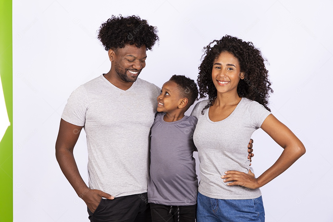 Mãe e pai feliz ao lado de seu filho sobre fundo isolado branco
