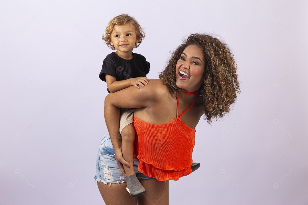 Linda mulher e garoto sobre fundo branco
