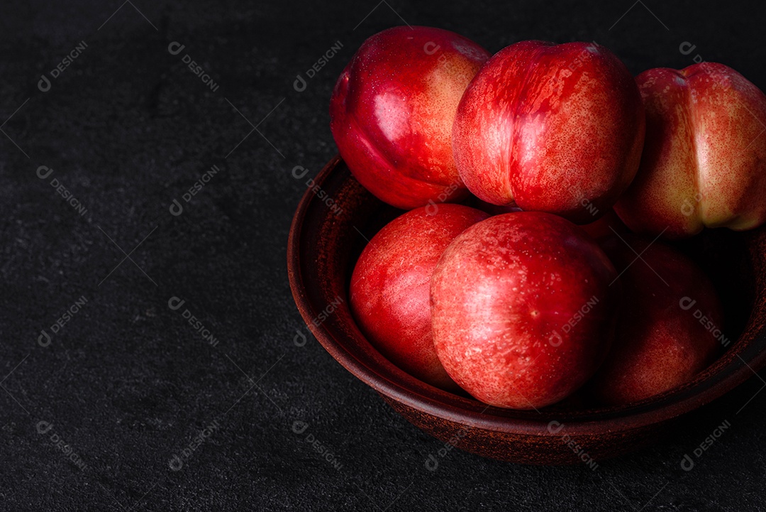 Deliciosos pêssegos ou nectarinas doces em uma tigela marrom sobre um fundo escuro de concreto