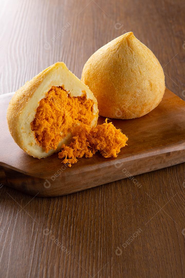 Coxinha, petisco tradicional da culinária brasileira recheado com f...