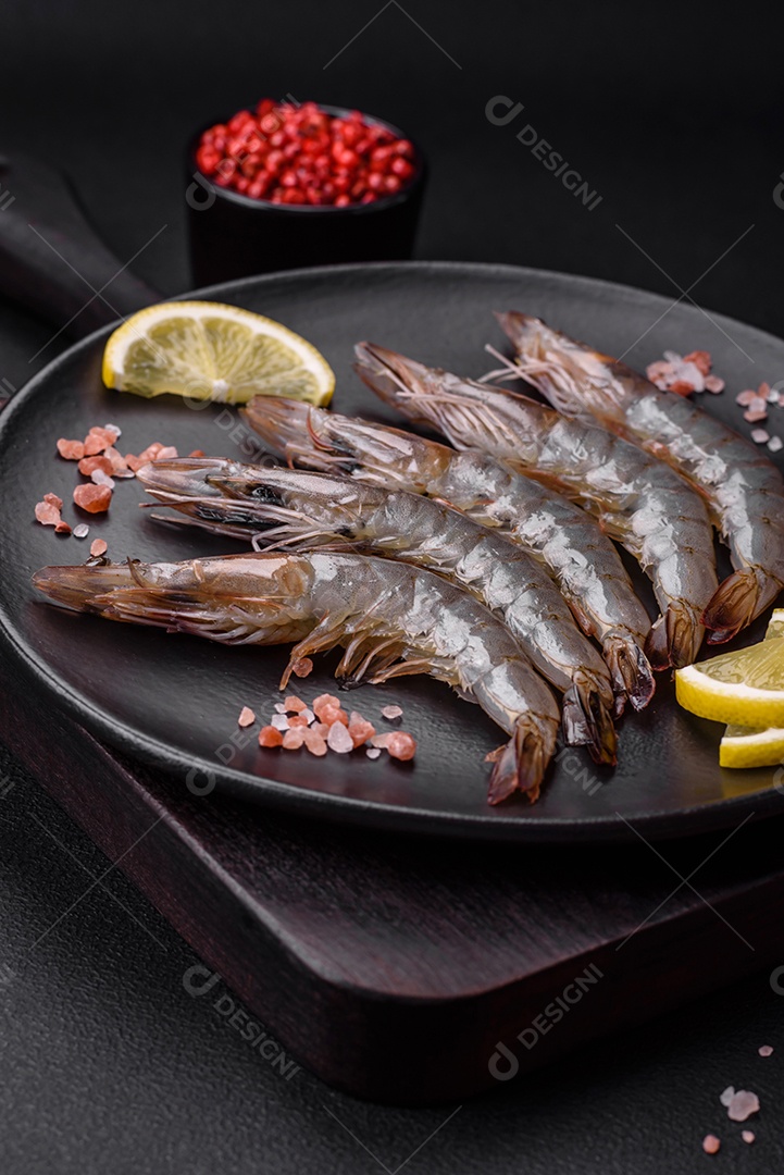 Camarão tigre ou lagostim cru com especiarias e sal em uma tábua de madeira sobre um fundo escuro de concreto